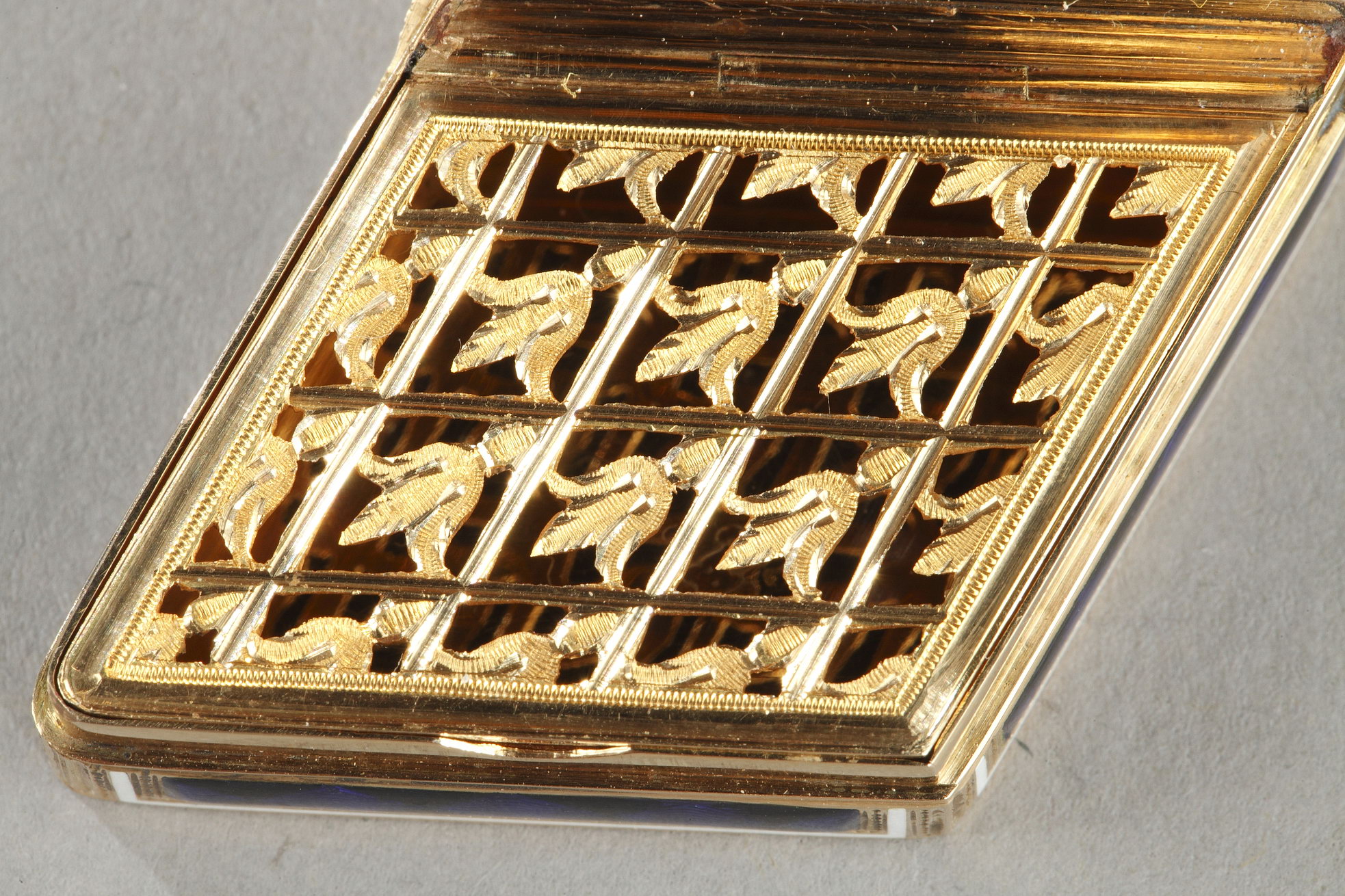 Diamond-shaped vinaigrette with enameled gold and bordered with pearls. The hinged lid is decorated with four winged cupid heads floating in the clouds. The sides of the lid are embellished with a taille d'épargne frieze with alternating flowers and dots in blue enamel. The body of the vinaigrette is decorated with translucent, royal blue enamel that leaves the intricate geometric pattern in the gold underneath visible. A band of white enamel frames the blue. Inside the vinaigrette is a protective grill featuring a floral motif that was used to hold a perfumed sponge in place.