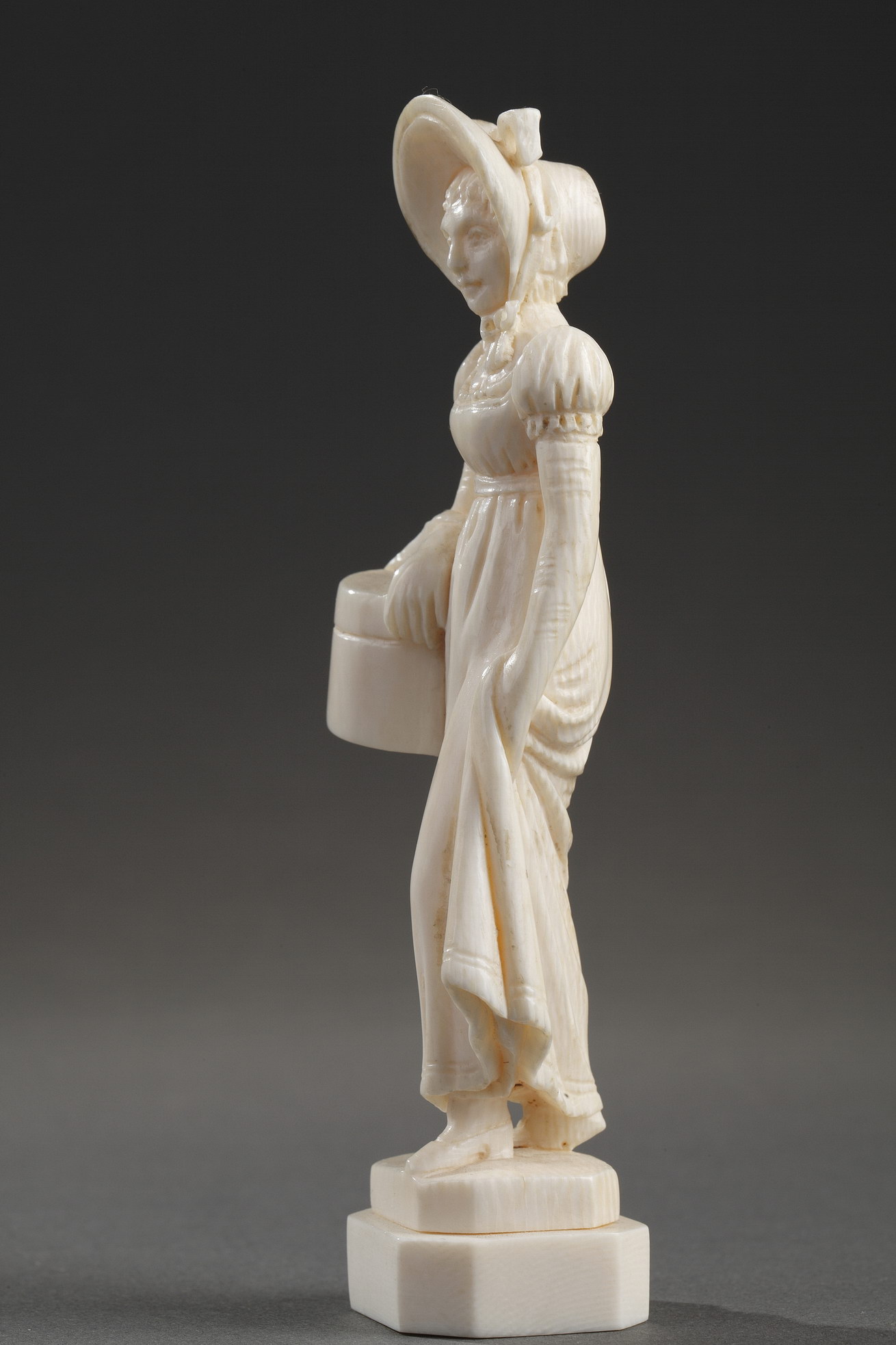 Set of six ivory carved figures representing characters illustrating old street trades. Thus is represented: the old player with his monkey, the screaming headwort, the seller of kitchen utensil with pots and strainers, the chimney sweep or young smoking Savoyard, and two elegant man and woman. These characters are strongly inspired by picturesque scenes from Callot. Some pieces are signed Migeon.