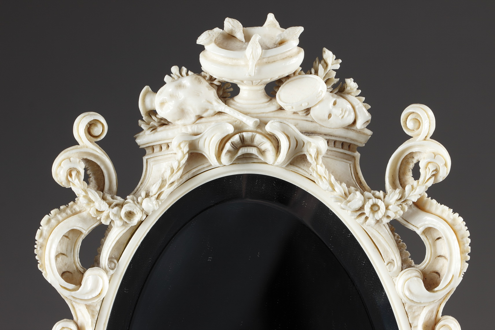 An oval mirror with carved ivory frame, topped by a vase with birds, flanked by a comic mask and musical instruments. Falling garlands and scrolls adorn the mirror. Child-shape handle surmounted by a basket filled with flowers, on a console hightened with scrolling foliages. During the July Monarchy in the 1830s, is developed a return to the style of the Renaissance Revival. This style touches all the arts including decoratif art and furniture. This style is influenced decorative repertoire of the 15th and 16th centuries. Very fine work of the city of Dieppe realized in the second half of the 19th century.